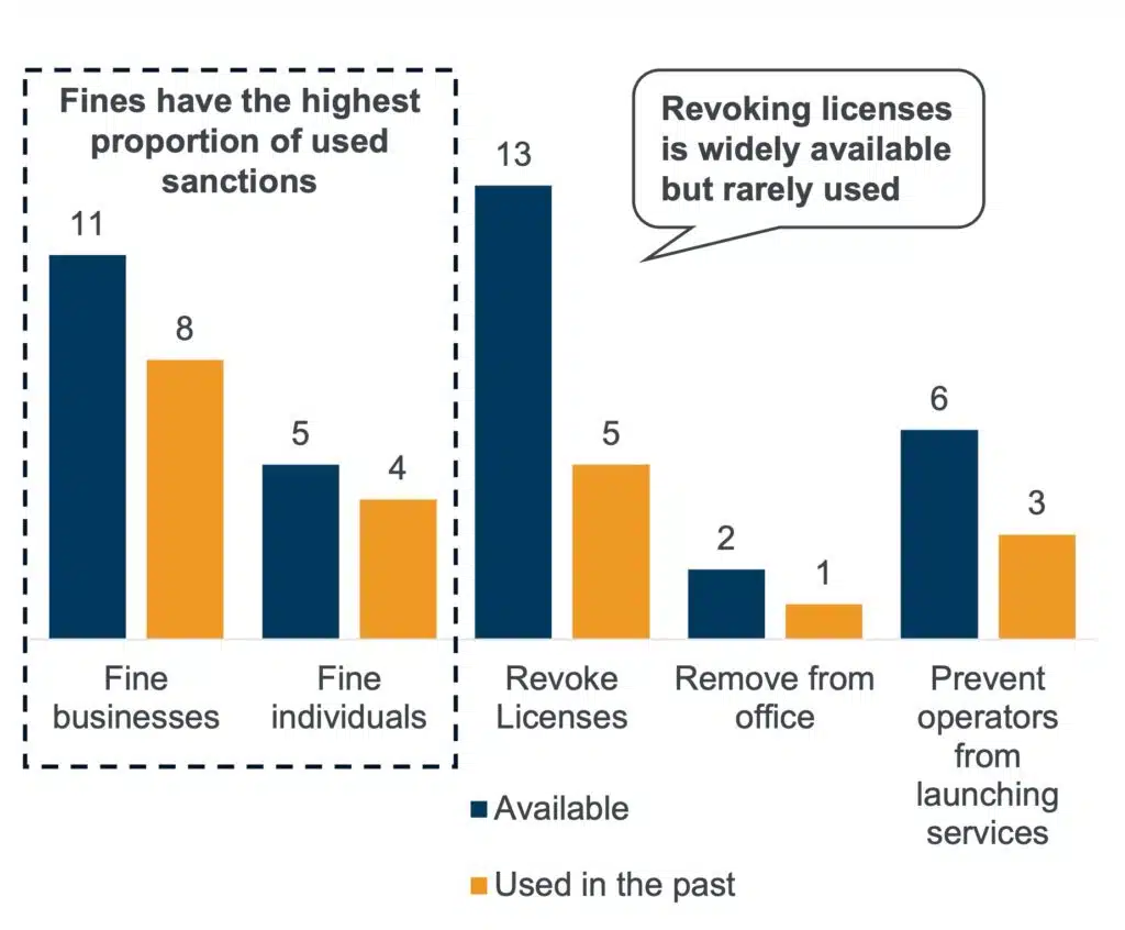 Sanctions are a key mechanism for regulators to enforce compliance, safeguard competition, uphold transparency and protect consumer confidence. Within the NRAs surveyed, fines emerged as the most frequently used tool, whereas the most severe option – revoking licences – is applied less frequently (of the 13 NRAs surveyed that have these powers, only five have used them). Nevertheless, having a broad menu of options probably acts as a strong deterrent, encouraging firms to comply with regulatory standards. A breakdown of which sanctions are available and how frequently they have been used in the past across the NRAs surveyed can be seen in Figure 1 below.